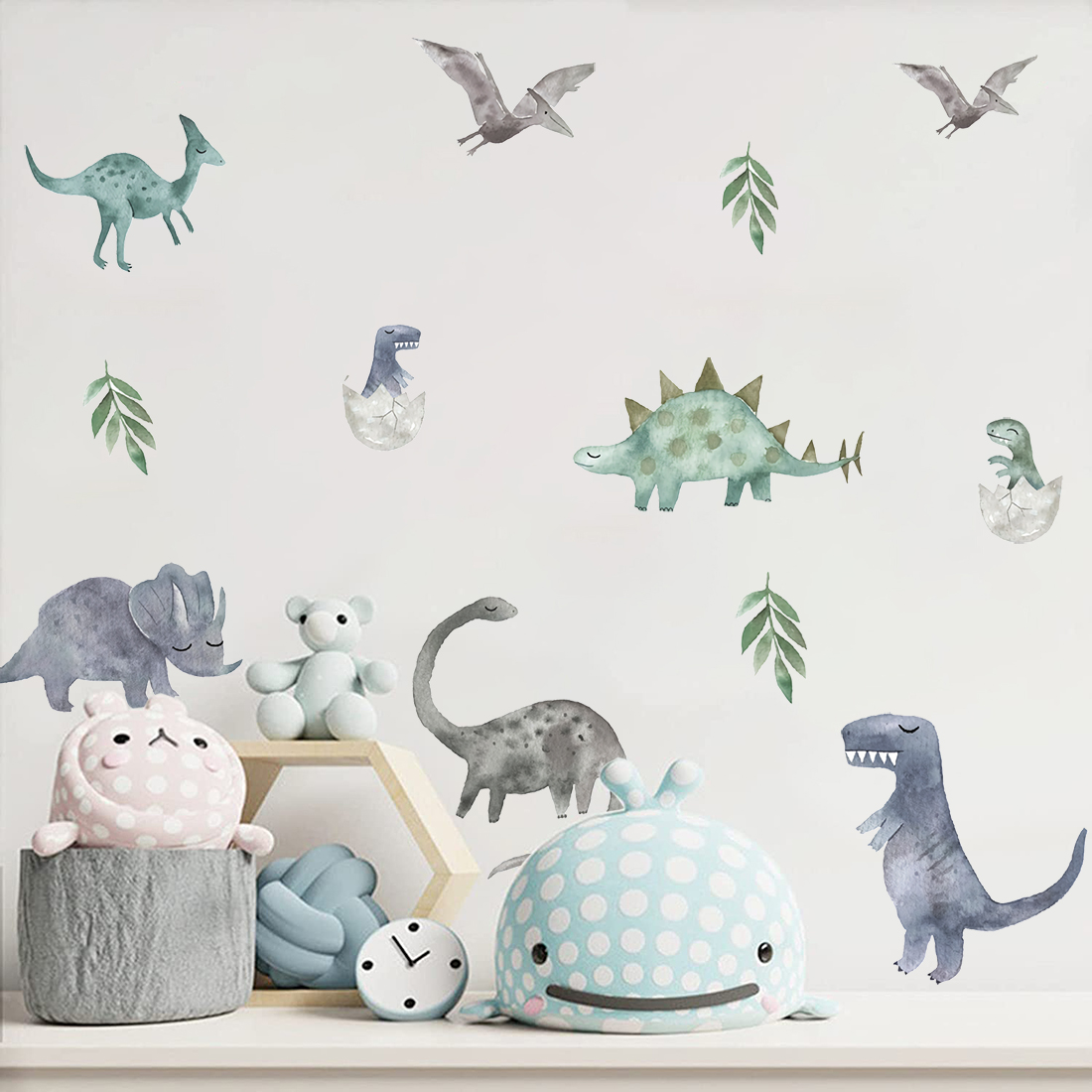 Dreaming Dinosaurs 12 wall stickers Dreaming Dinosaurs wall stickers are a great educational tool and a fun way to decorate your room. Dreaming dinosaurs are peaceful and the set includes Stegosaurus, Tyrannosaurus, Brontosaurus, Pterodactyl, Parasaurolophus, and Triceratops.